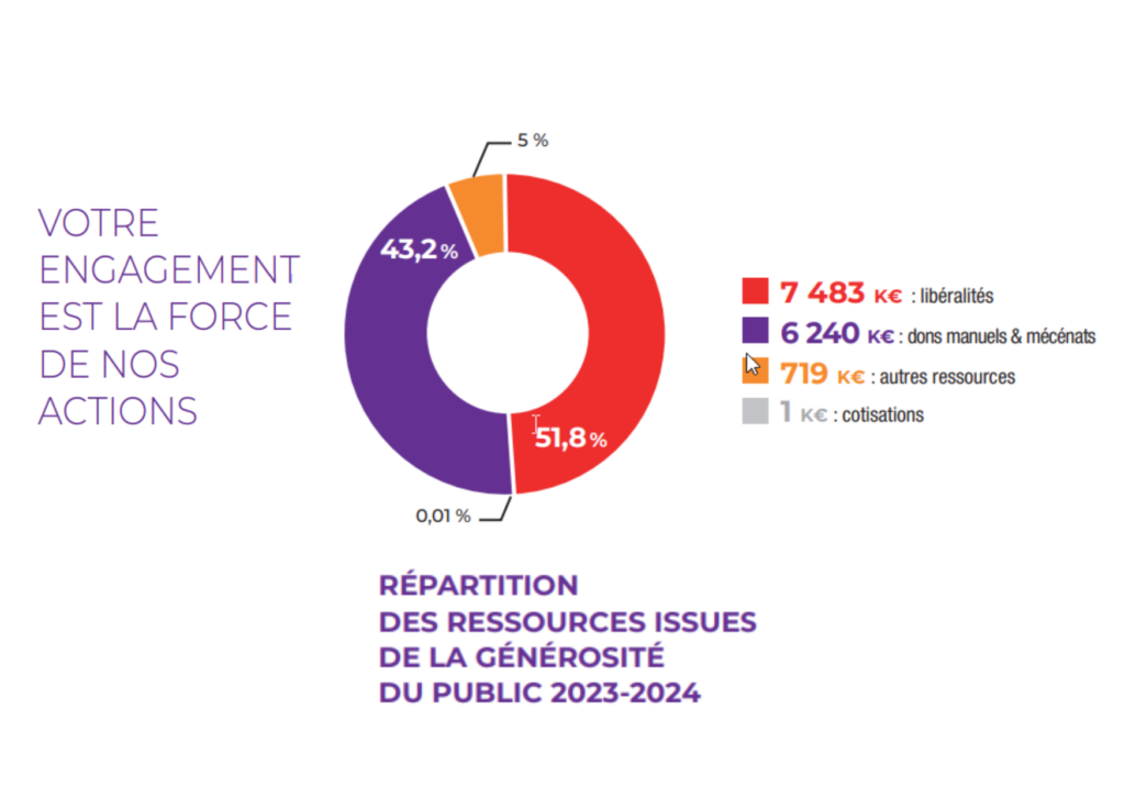 Les emplois financés par la générosité du public s’établissent à 15,7 M€ en augmentation de 1,9 M€ par rapport à l’exercice précédent.